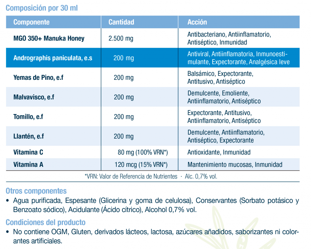 | Descripción | Miel de Manuka Monofloral de alta concentración MGO 350+ de Nueva Zelanda, extractos de plantas, Andrographis paniculata, vitaminas A y C. |