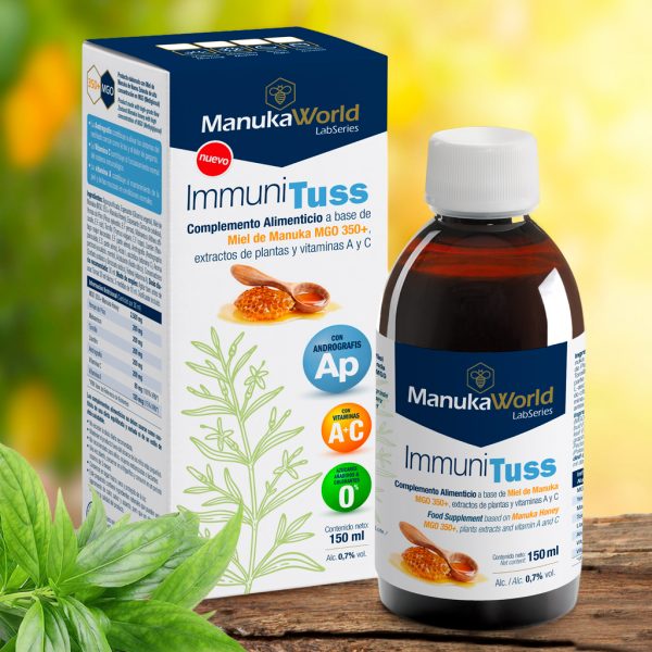 ImmuniTuss es un novedoso y avanzado complemento alimenticio especialmente formulado para los problemas de tos y garganta, que no sólo ayuda a calmar su sintomatología sino que también actúa sobre el origen de la misma. La combinación sinérgica de la auténtica Miel de Manuka MGO 350+ de Nueva Zelanda, los extractos de plantas (como Andrographis paniculata) y las vitaminas A & C, convierten a ImmuniTuss en el único producto disponible en forma líquida en contener Miel de Manuka y Andrographis paniculata con todos sus beneficiosos efectos bioactivos para la salud.